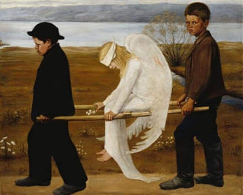 Написана в 1903 году финским художником-символистом Хуго Симбергом (1873-1917). Её сюжет неоднозначен и целиком зависит от интерпретации. На ней изображены два мальчика, несущие на носилках обессиленного белого ангела с перебинтованной головой и кровоточащим крылом. Мальчики одеты в тёмную одежду. У них суровые выражения лиц. Их посыл, относительно ангела, не вполне ясен. Непонятно, куда его несут, и что с этой хрупкой детской фигуркой будет дальше (что вызывает определённое беспокойство, ведь все мы любим счастливый финал). К слову, сам автор отказывался разъяснять смысл картины, предоставив зрителю самостоятельно решить эту загадку.