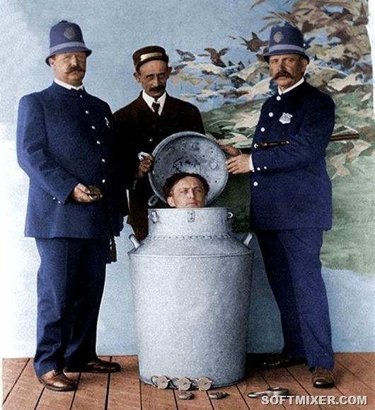 Рядом с бидоном уже стоял Гудини, который держал в руках разомкнутые наручники. Секрет был в двойных стенках бидона. Пространство между стенками заполнялось водой, а в крышке были воздушные клапаны, позволяющие Гарри дышать.