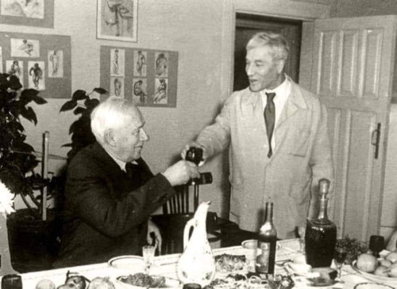 Он мне сказал: "Это примечательная фотография. Эта фотография снята в тот день, когда было сообщено о том, что Борис Леонидович получил Нобелевскую премию. И вот я пришел его поздравить, а он смеется, потому что я ему, который всю жизнь свою ходил в каком-то таком странном парусиновом рабочем костюме, я ему рассказывал о том, что ему теперь придется шить фрак, потому что Нобелевскую премию надо получать во фраке, когда представляешься королю".