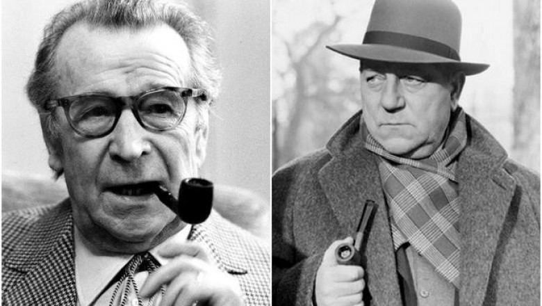 Слева — Сименон и Жан Габен на съемках фильма о Мегрэ, справа — Брюно Кремер в роли комиссара