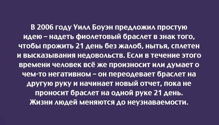 Часто мы встречаем тезис: «Хочешь изменить жизнь к лучшему – измени свои мысли». Перестань зацикливаться на негативе, сравнивать себя с кем-то, сплетничать и жаловаться. Кажется, что это не так и сложно. Более того, многие люди действительно совершенно искренне считают, что мыслят исключительно в позитивном ключе. Чтобы перестроить свои мысли и проверить себя, Уилл Боуэн предложил надеть фиолетовый браслет и честно проносить его на одной руке руке 21 день без жалоб.