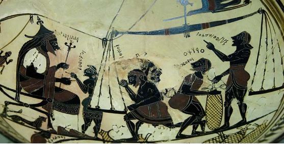 Фото: Ваза с изображением царя Киренаики Аркесилая, загружающего сильфий, считающийся обладающим противозачаточными свойствами, на корабли для экспорта. Спартанский килик, ок. 580-550 гг. до н.э. Источник: Marie-Lan Nguyen / Wikimedia Commons ∇
