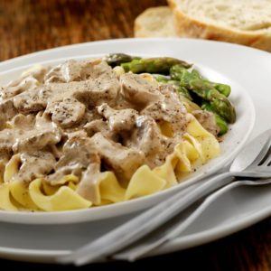 Для таких то столов и было изобретено блюдо — готовить его было удобно, легко делилось на порции, и к тому же вкусное. По одной из версий, авторство блюда принадлежит одному из поваров графа, который успешно объединил приемы русской кухни (соус подается вместе с мясом, а не отдельно) с технологией французской кухни (мясо обжаривается и подается с соусом). По другой версии блюдо было изготовлено французским поваром Андре Дюпоном, который служил у Строганова и учел, что у графа к старости повыпадали зубы.
