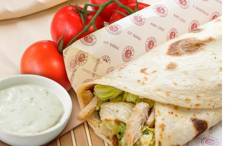 — 1 пшеничная лепешка — Индейка — Сыр сулугуни — Салат айсберг — Китайский салат — Помидоры — Огурцы — Петрушка, укроп и другая зелень — Тертый чеснок и репчатый лук — 60 мл простокваши (1% жирности) — Сок половинки лимона — Салатная заправка — Черный молотый перец и соль