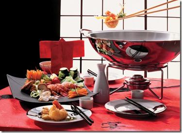 Все блюда подаются одновременно и надо попробовать понемногу все, что есть на столе, и только после этого остановиться на наиболее понравившихся. Часть блюд (обычно это закуски, такие как суши, роллы, куски рыбы или мяса и прочее) выкладываются на общие блюда, а каждому участнику обеда даётся небольшая тарелка, на которую он накладывает то, что хочет попробовать.
