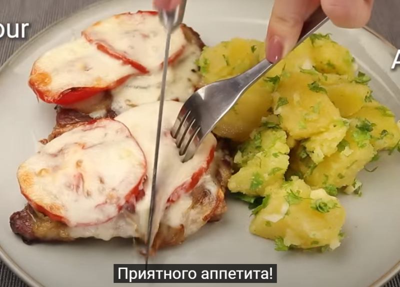 Свинина 1кг. Соль. Черный перец. Паприка. Лук 2-3 шт. Вода. яблочный уксус 1 чайная ложка соль 1 чайная ложка сахар 1 чайная ложка Оставьте на 15-30 минут. Помидоры 2 шт. Выпекать 40 минут при 180°С. Сыр 120 гр.  Выпекать 5 минут при 200°С. Картофель 4 шт. Чеснок 2 зубчика. Кориандр. Масло.