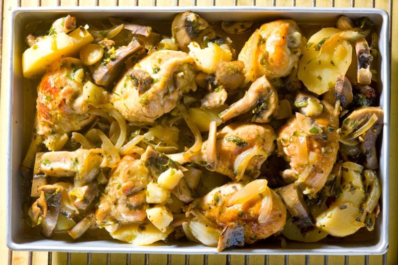 Берем подходящую для духовки посуду или огнеупорную стеклянную форму. На дно выкладываем картошку – в один или два слоя. Посыпаем солью и белым перцем. Сверху выкладываем курицу, а на нее жареные грибы. Накрываем и запекаем в духовке в течение часа. Вынимаем из духовки и подаем.