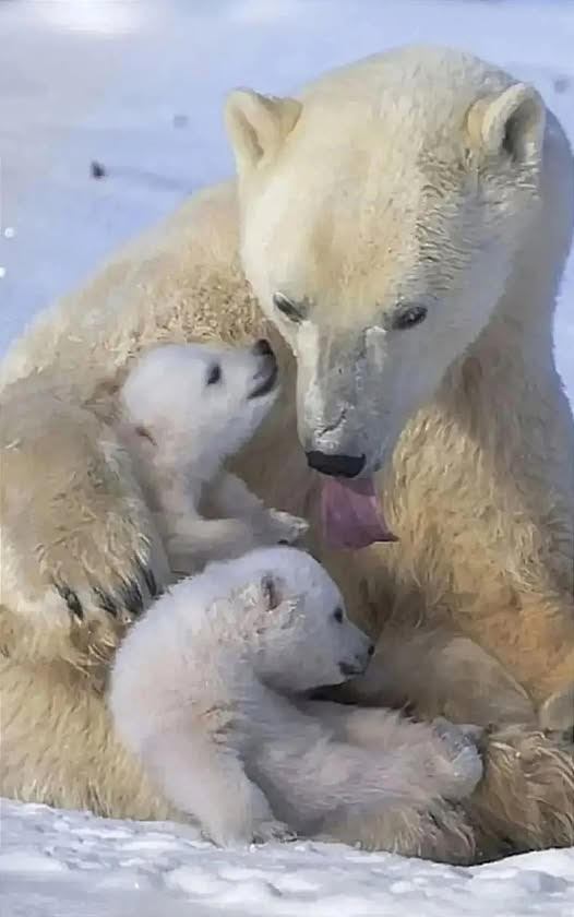 Белый медведь — животное не только огромное, но и грозное, и даже свирепое. Особенно свирепа медведица-мать, оберегающая своих детенышей. И это неудивительно. Ведь в первый год жизни — из-за суровых условий жизни, а то и голода — погибает до 40% медвежат. Те же, кто выжил, обязаны этим только постоянной материнской заботе и защите от всех, включая взрослых медведей-самцов. Даже полутора-двухлетний медвежонок, оставшись по какой-нибудь причине в одиночестве, бывает обречен на гибель. Но, оказывается, в такой ситуации его нередко "усыновляет" другая медвежья семья.