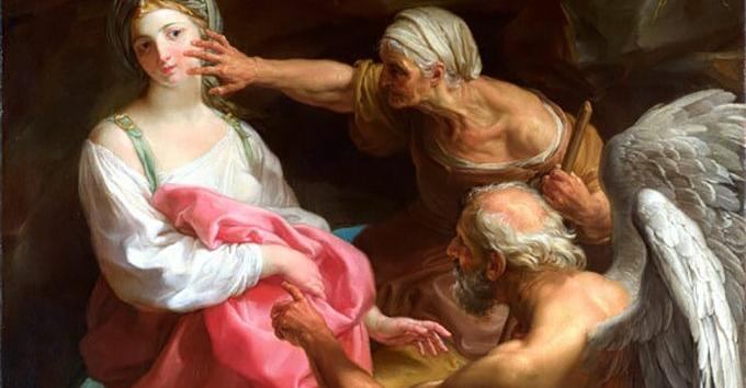 Это полотно итальянского художника XVIII века Помпео Батони “Время приказывает старости уничтожить красоту”.