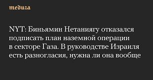 Премьер-министр Израиля Биньямин Нетаниягу отказался подписывать план наземной операции в секторе Газа, который ему представило командование армии обороны Израиля (ЦАХАЛ), рассказали The New York Times два информированных источника.