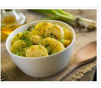 Отварить несколько картофелин, нарезать кубиками. Красную луковицу нарезать и замариновать в винном уксусе. Затем соединить лук и картофель, приправить зернистой горчицей.