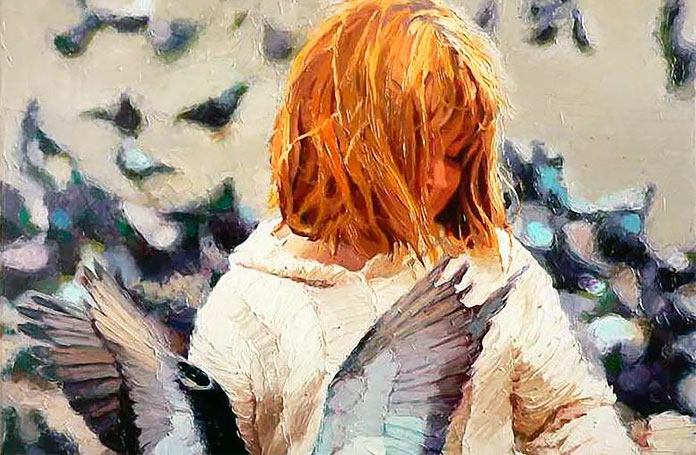 С крыш, с проводов, откуда не возьмись огромное полчище голодных голубей стремительно пикирует к ногам визжащей от восторга Лиды.