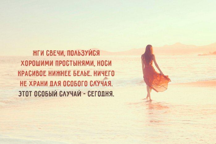 Жги свечи, пользуйся хорошими простынями, носи красивое нижнее белье. Ничего не храни для особого случая. Этот особый случай – сегодня.