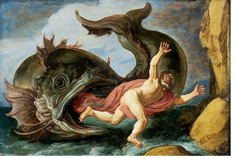 «И повелел Господь большому киту поглотить Иону, и был Иона во чреве этого кита три дня и три ночи». Но дело кончилось благополучно, проглоченный взмолился о пощаде, кит его выплюнул, и пророк ещё успел спасти от гибели жителей Ниневии, предупредив их, что, если они не покаются в грехах, город будет разрушен.