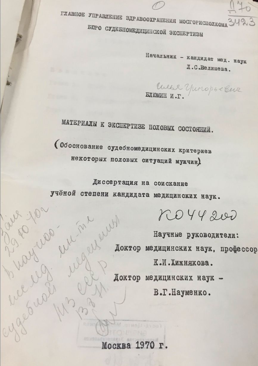 Особенно тесно медики и правоохранительные органы СССР сотрудничали в сфере борьбы с «мужеложеством». Так, в 1970 году сотрудник Московского бюро судебно-медицинской экспертизы Иван Блюмин написал целую диссертацию о том, как выявить признаки совершенного полового акта между двумя мужчинами по их половым органам. Милиция охотно поставляла ему «преступников», а Блюмин охотно их исследовал. Тем не менее снабдить МВД конкретными инструкциями по обнаружению признаков «мужеложества» Блюмину не удалось. Судмедэксперт ограничился лишь общими рекомендациями.