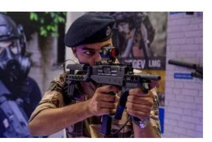 Одед Ярон, «ХаАрец», М.Р. На фото: пистолет-пулемет UZI Pro совместного производства Израиля и Индии на Международной выставке Police Expo 2021 в Нью-Дели. AP Photo Altaf Qadri