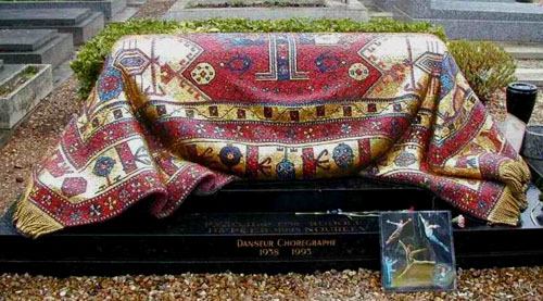 Скончался Нуриев в 1993 году и был похоронен на русском кладбище Сен-Женевьев де Буа под Парижем. И примерно тогда же один из ведущих художников Парижской Опера (Paris Opera) Энцо Фриджерио (Ezio Frigerio), друг и коллега танцовщика, высказал идею оформления могилы с помощью восточного ковра. Нуриев коллекционировал старинные ковры и вообще древний текстиль разных стран, особо любимые ковры кочевали с ним по гастролям, вдохновляя на новые потрясающие танцы и представления.