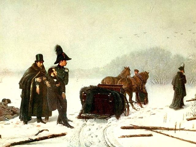 Секундант подал ему новый пистолет вместо упавшего в снег — опершись на одну руку, из положения лежа поэт выстрелил в противника.
