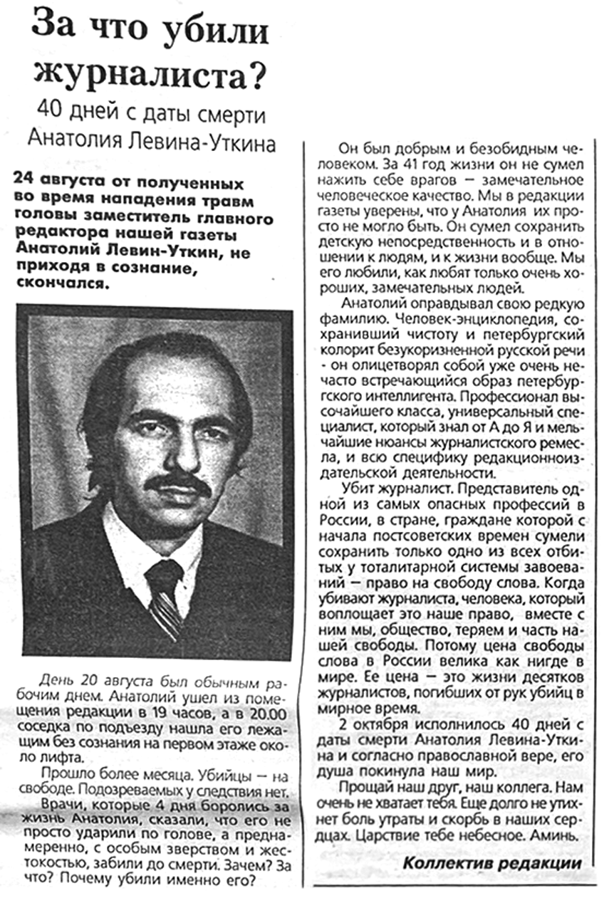 Вечером 20 августа 1998 года редактор еженедельной газеты "Юридический Петербург сегодня" Анатолий Левин-Уткин возвращался домой после затянувшегося рабочего дня. На днях ему исполнился 41 год – празднование совпало с началом крупнейшего финансового кризиса в постсоветской истории: резко выросли цены, банки перестали выполнять обязательства, на улицах выстроились очереди из вкладчиков. "Мы проснулись в другой стране", – писало главное деловое издание России "Коммерсант".