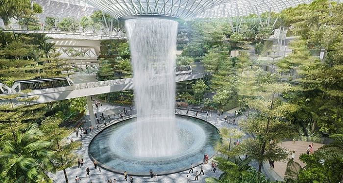 Многофункциональный комплекс аэропорта Jewel Changi Airport занимает 134 квадратных метра площади и состоит из 10 этажей, 5 из которых спрятаны под землей. На территории находятся собственные достопримечательности, отель и сад, увенчанный водопадом Rain Vortex, воды которого падают с дизайнерской крыши. Выглядит впечатляюще, но на самом деле водопад выполняет исключительно практичную функцию: он перекачивает дождевую воду, которой, учитывая частые грозы, в Сингапуре более чем достаточно. Кроме того, поток охлаждает воздух под куполом здания, а собранная вода идет на нужды аэропорта.