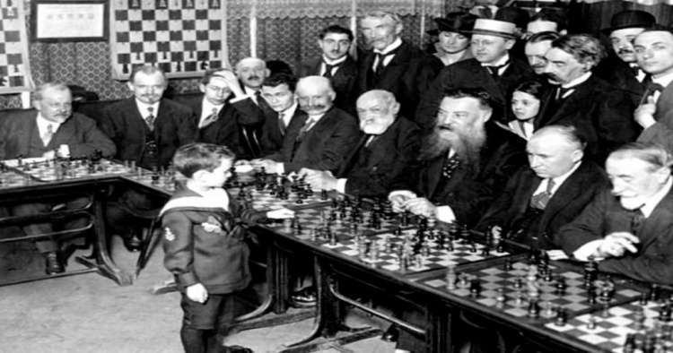 Как-то раз на просторах интернета мне на глаза попалась удивительная фотография, на которой мальчишка в шортиках и матроске проводит шахматный сеанс одновременно с двенадцатью взрослыми, серьезными мужчинами.