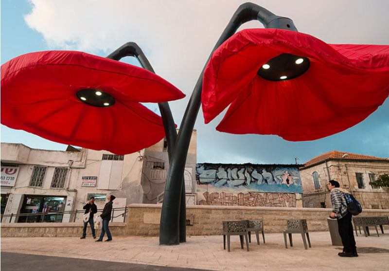 Архитекторы и дизайнеры любят поражать своими идеями и изобретениями. Так иерусалимским пешеходам они подарили уникальное зрелище: на улицах установили фонари в виде цветов, которые раскрываются, когда к ним кто-то приблежается. Гигантские цветы реагируют как на людей, так и на транспортные средства.