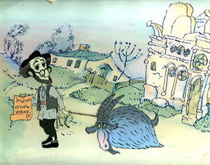 Мы с Эдуардом написали сценарий, потом чудом нашли деньги: в 1990-м «еврейская тема» считалась скользкой, и на госфинансирование рассчитывать не приходилось. Кроме того, не было никаких материалов – картинок, костюмов. Я помню, как мы радовались, когда нам подарили открыточку с алеф-бетом. Интернета тогда не было, но слух о том, что снимается еврейский мультфильм, распространялся, идобровольные помощники приносили, что у кого было. Кто фото, кто книжечку. Снимали мы фильм с перерывами более трех лет, и несмотря на многие Сциллы и Харибды, наша одиссея счастливо закончилась. Это были годы счастья одолений и открытий. Но говорить мне об этом подробно не хочется, слишком грустная у фильма судьба.